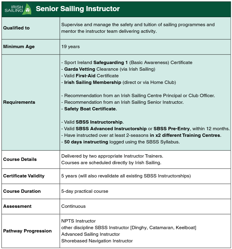 The Pre-Requisites to become an Irish Sailing Senior Instructor for all discilpines are;